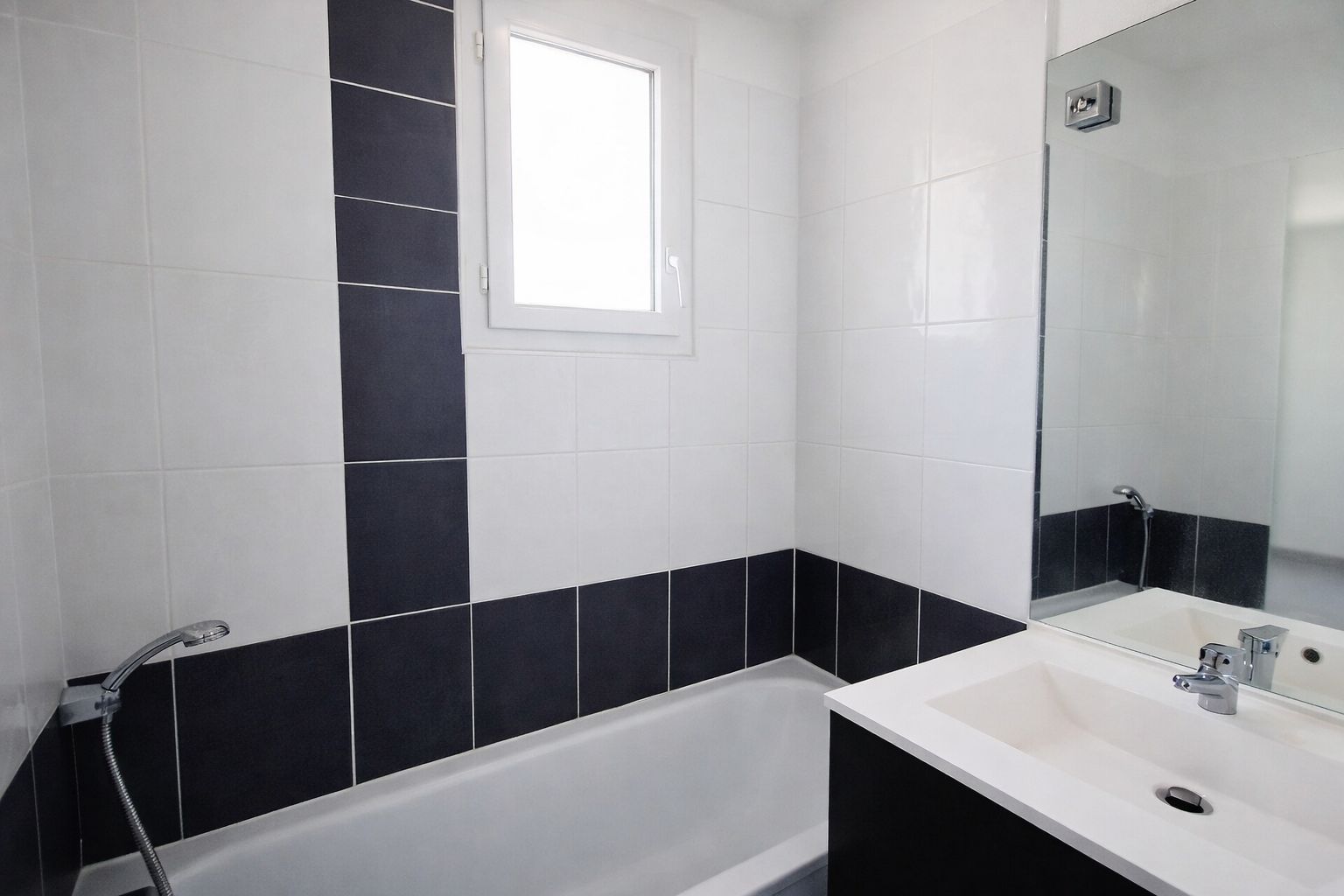 La chambre, confortable et dotée de rangements, mène à une salle de bains avec fenêtre, un détail rare et très apprécié, apportant lumière naturelle et ventilation.